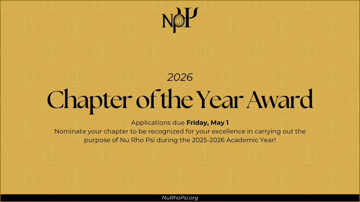 Are you part of a chapter that has excelled in carrying out the mission of Nu Rho Psi during the 2025-2026 Academic Year? Tell us about it by nominating your chapter for this year’s Chapter of the Year award! This award annually recognizes a chapter’s accomplishments at the local, state, and/or national levels, demonstrated through...